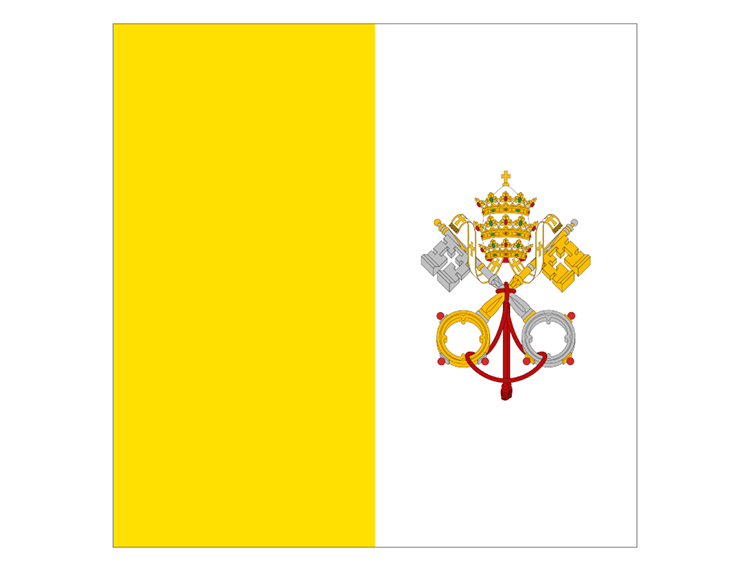 标志介绍: 梵蒂冈国旗由两个面积相等的竖长方形组成,靠旗杆侧为黄色,另一侧则为白色。 梵蒂冈国旗白色上还绘有教皇的牧徽:两把交叉的圣伯多禄的钥匙和一顶教宗的三重冕。黄白两色是耶稣十二宗徒之长圣伯多禄的两把钥匙的颜色,代表了两种最珍贵的金属:金与银。教宗的牧徽则是至高无上地位的象征。旗上的金黄和银白色是自1808年2月以来教廷卫兵瑞士卫队帽徽的颜色。于1825年时教宗良十二世订定这面旗帜。 AI格式,矢量国旗,国旗,梵蒂冈国旗,矢量素材